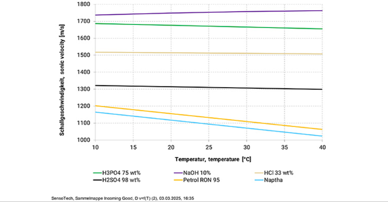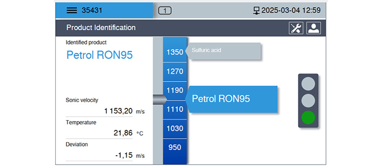 Em muitas aplicações, um líquido específico é designado para cada tanque. Nesses casos, o LiquiScope pode ser utilizado como verificação de valor nominal em comparação ao valor real. Um valor de referência de velocidade do som é configurado e, caso o valor medido ultrapasse significativamente a tolerância estabelecida, o sistema identifica o desvio e o enchimento pode ser interrompido.
