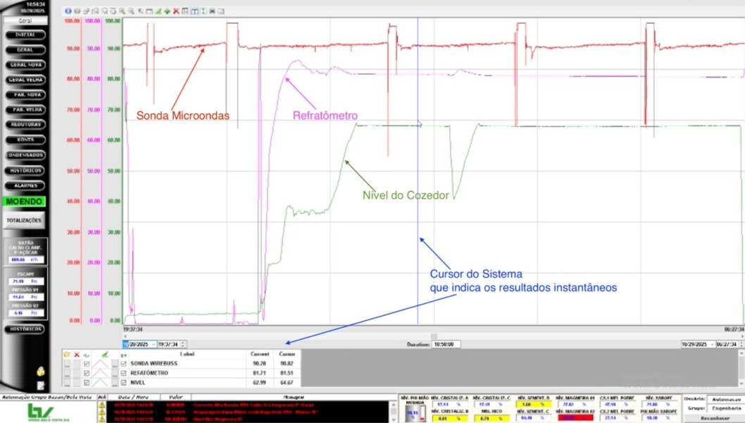 Curva de processo exibindo a correlação entre sonda de micro-ondas, refratômetro e nível do cozedor, com indicação do cursor do sistema para leitura instantânea dos valores.